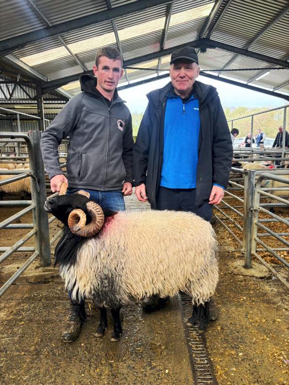 Bryan Grealish, Ballycroy (left) purchaser of the top priced ram at €7,200 and breeder Sean Halloran, Clonbur, Co Galway. See pedigree for full report.