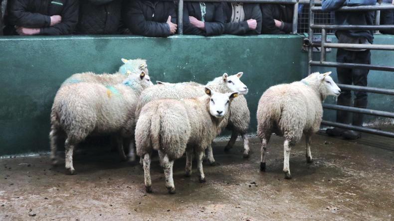 A group of strong ewe lambs weighing 49kg on average sold for €115 each(€2.35/kg).