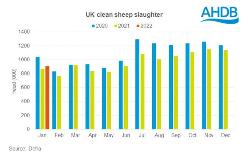 The number of sheep slaughtered in January 2022 was 4% higher for lambs and 16% higher for ewes.