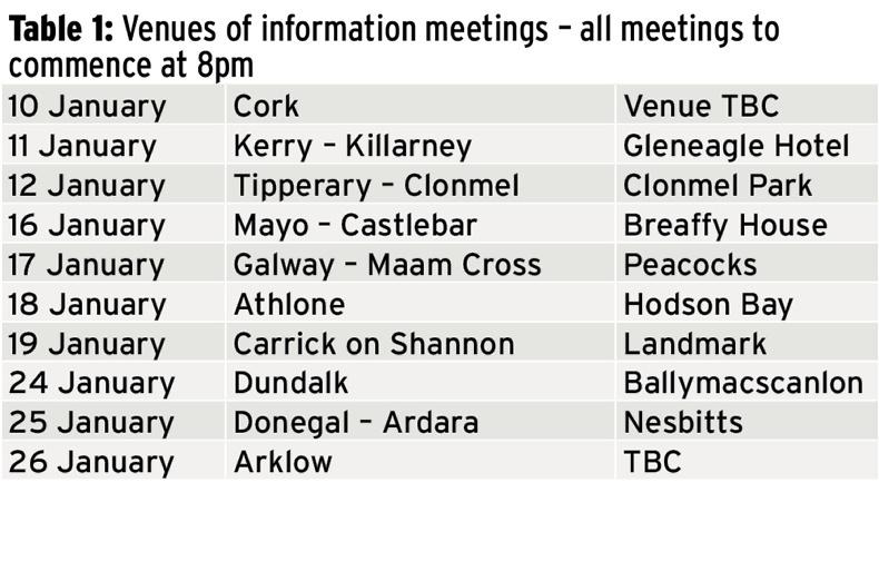 It is important to note that entry into the scheme is not automatic and interested farmers will have to complete an application form to join the scheme. The Department is getting ready to circulate application forms and terms and conditions of the scheme to those registered as keepers of sheep on their database. These are likely to arrive to farmers at the end of this week/start of next week. The deadline for receipt of applications is 31 January 2017, the same deadline as the sheep census. The department has also organised a series of information meetings which will take place during January. These are outlined in Table 1.