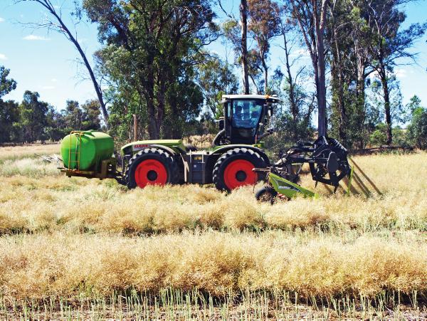 We reversed the cab, purchased a 41ft twin discharge three-point-linkage front windrower and then made a frame for a 4,000L tank, which we mounted on the front three-point-linkage, and then plumbed a spray-line on the windrower to kill the canola as we windrow it.