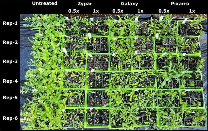 Figure 2: Response of an ALS-resistant poppy population from Kildare following application of half and full label rates of the ALS + hormone herbicides Zypar (1x = 0.75l/ha) and Galaxy (1x = 1l/ha) and the hormone-type Pixarro (1x = 0.5l/ha). Each product was tested in six replicates (Rep).