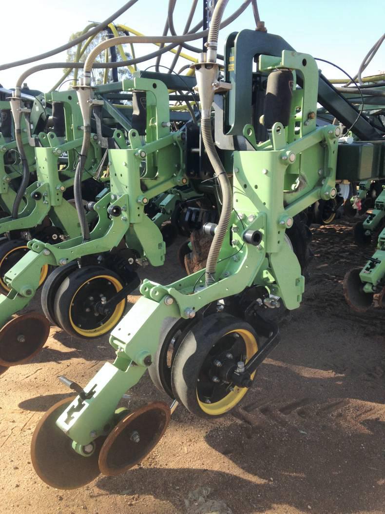 The reason we chose this planter is that we can configure the rows on the machine so we can lift up the front three gangs and plant sorghum on 1m row spacing by just using the rear gang. Alternatively we can lift up the middle two gangs to potentially plant canola and pulse crops on 50cm spacings, with the cereals on 25cm row spacings to help with weed competition.