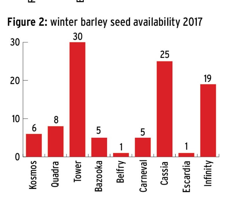 Cassia, Tower and Infinity will be the main two-row winter barley varieties again this year (see Figure 2). Between them they account for a potential 74% of seed availability for 2017 planting. Cassia’s rhyncho and mildew ratings continue to be challenging for growers and these must be watched.