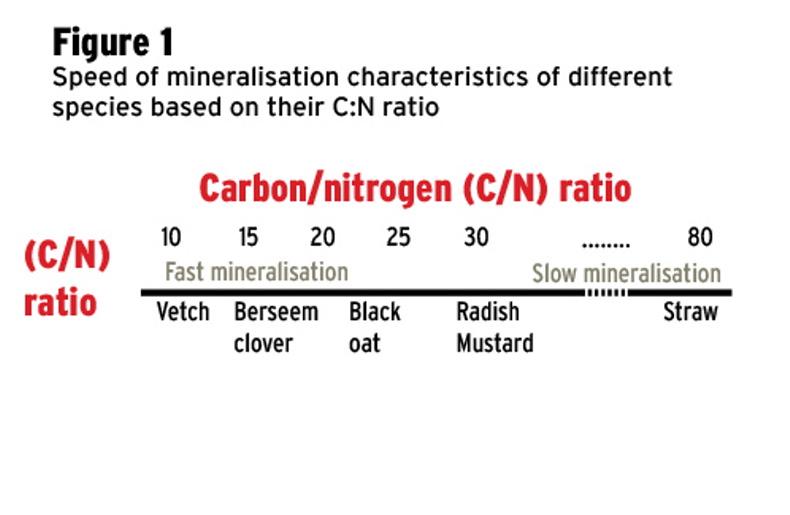 The carbon to nitrogen (C:N) ratio is important because it influences the speed with which plants can break down and release their nutrients, via mineralisation, to the following crop. This is shown for different species in Figure 1, where species such as vetch (C:N 10) or Berseem clover (C:N 15) are capable of mineralising and recycling their nutrients much faster than something like straw (C:N 80).