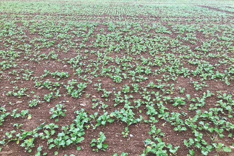 Oilseed rape with companion crops of buckwheat, clover, sunflower and vetch. The volunteer cereals will be controlled with Kerb Flo in January.