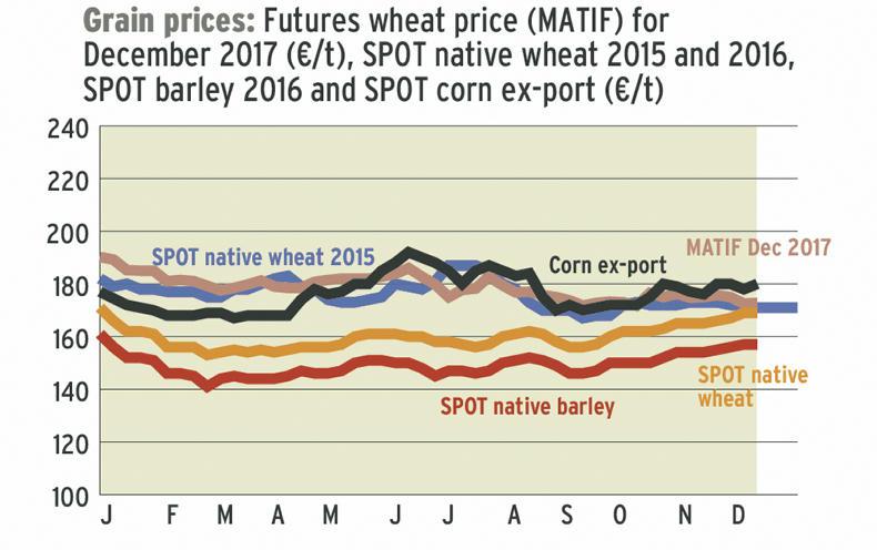 March/May prices are around €172/t for wheat and €160/t for barley, but there are not many buyers this far out. November new-crop prices are similar at €168 to €170/t for wheat and €158/t for barley.