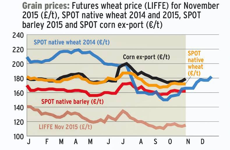 Native prices remain broadly similar, with spot wheat and barley still in the €170 to €173/t range and barley around €160 to €163/t. Forward prices for May are stronger at €178 to €180/t for wheat and €10 under for barley. Prices for November 2016 are up slightly with €183 to €185/t talked about for wheat and €173 to €175/t for barley.