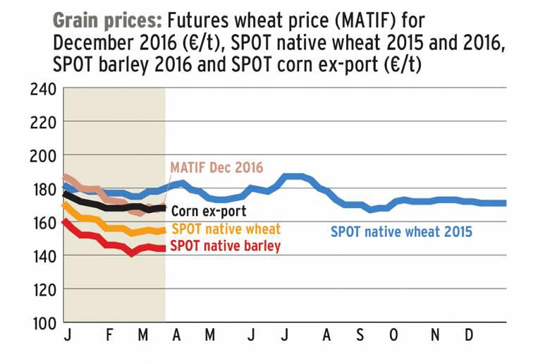 Meanwhile, native prices have strengthened somewhat, for the moment. Spot wheat has ranged between €153 and €158/t, depending on the hour and the day. Spot barley is tending more in the €144 to €146/t range. At this point, there is little or nothing in the way of a premium or carry for May sales.