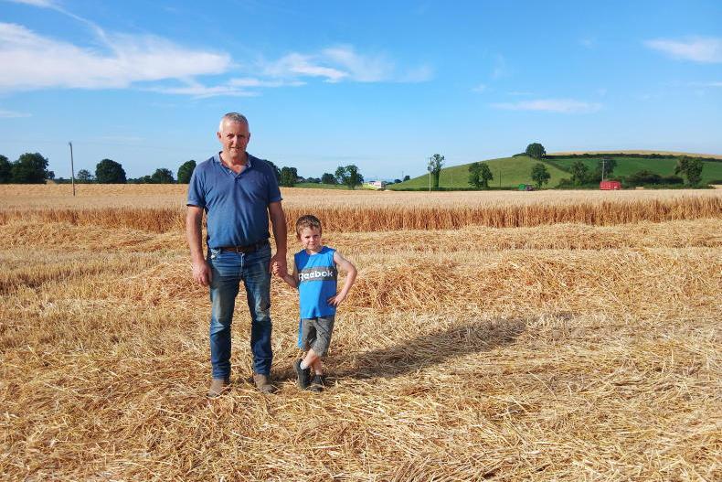 Pat Byrne and his son Seán Byrne check out harvest 2025 in Co Louth. Pat's brother Peter Byrne is driving the combine in the background. \ Siobhán Byrne