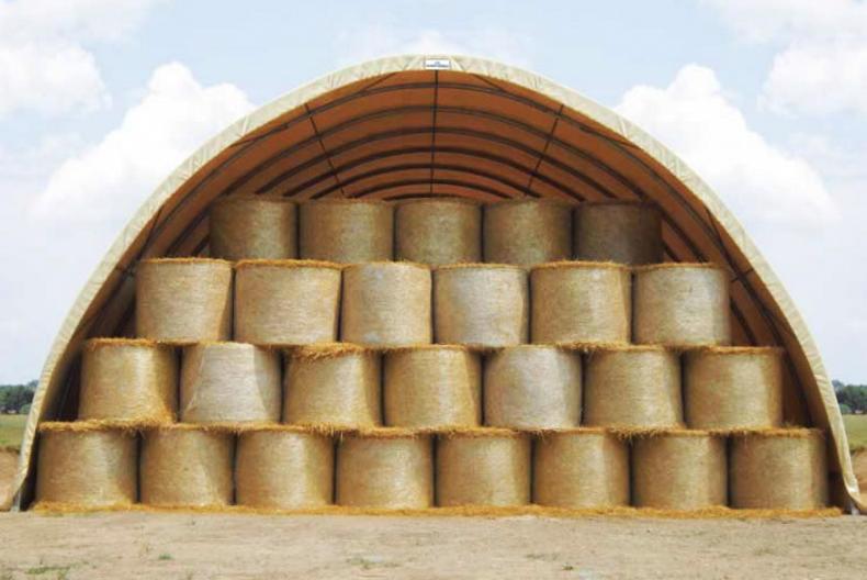 A large Shelterall structure providing cover for up to 28 round bales per 1.25m of length.