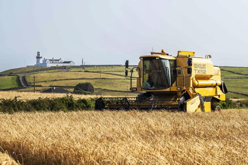 On a very warm but overcast day, John Hayes agri-contractors harvests spring barley for Clonakilty Distillery using a New Holland TX62 combine harvester with Galley Head Lighthouse as a backdrop. The barley will be used to make whiskey. The spring barley was Goldthorpe, a specialist ancient seed which has been used since 1910. Moisture content was 17% with a yield of two 1/2 tonnes per acre, with 15 acres to be harvested in Galley Head, Co Cork. \ Andy Gibson
