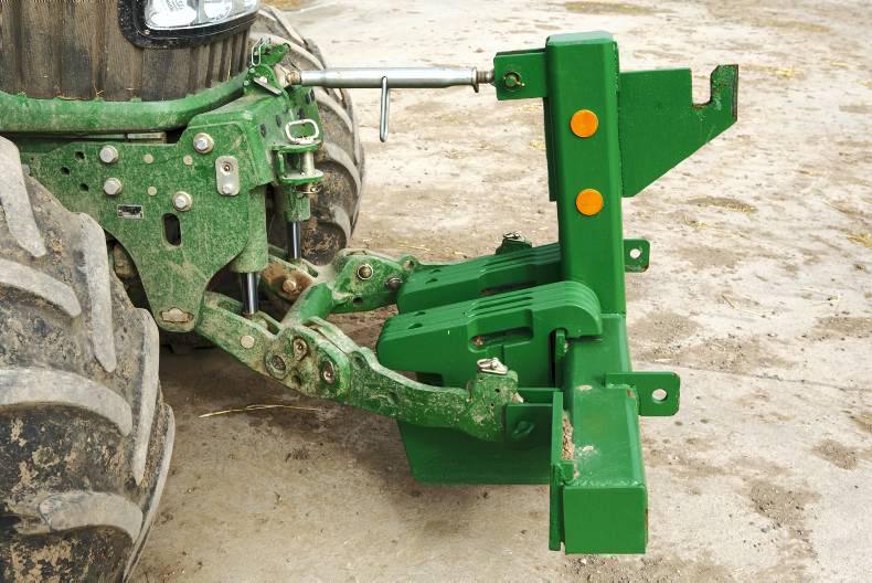 This linkage unit allows John to just drive up to the press, pick it up using the link hook, lock it in place using the lower links and drive to the next destination. The linkage unit also saves the hassle of having to use a strap or chain to drag it about in a field.