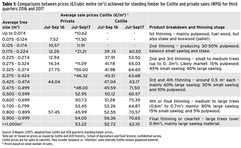 There was insufficient price data available for the third quarter in 2016 to draw clear price comparisons for the same period this year. However, prices were down on 2015, which was expected as 2014 and 2015 were exceptionally buoyant years for all timber sales – private and Coillte.