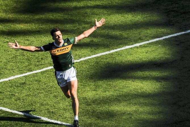 The front cover of the book is David Clifford of Kerry celebrating after scoring his side's first goal during the All-Ireland Senior Football semi-final against Tyrone in Croke Park. \Ramsey Cardy/Sportsfile